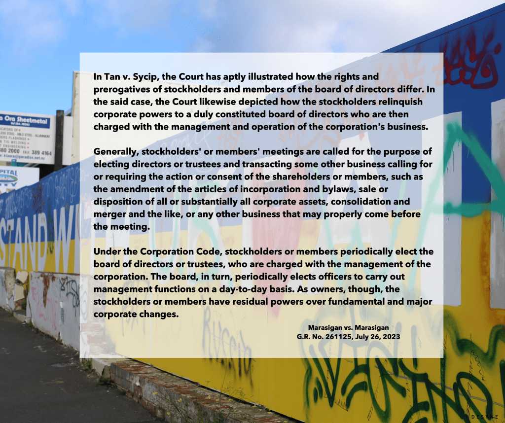 Under the Corporation Code, stockholders or members periodically elect the board of directors or trustees, who are charged with the management of the corporation. Causing Dela Cruz Law Office is a corporate law practitioner in Iloilo City. Share this: Click to share on X (Opens in new window) X Click to share on Facebook (Opens in new window) Facebook Like Loading... Leave a comment Cancel reply Δ