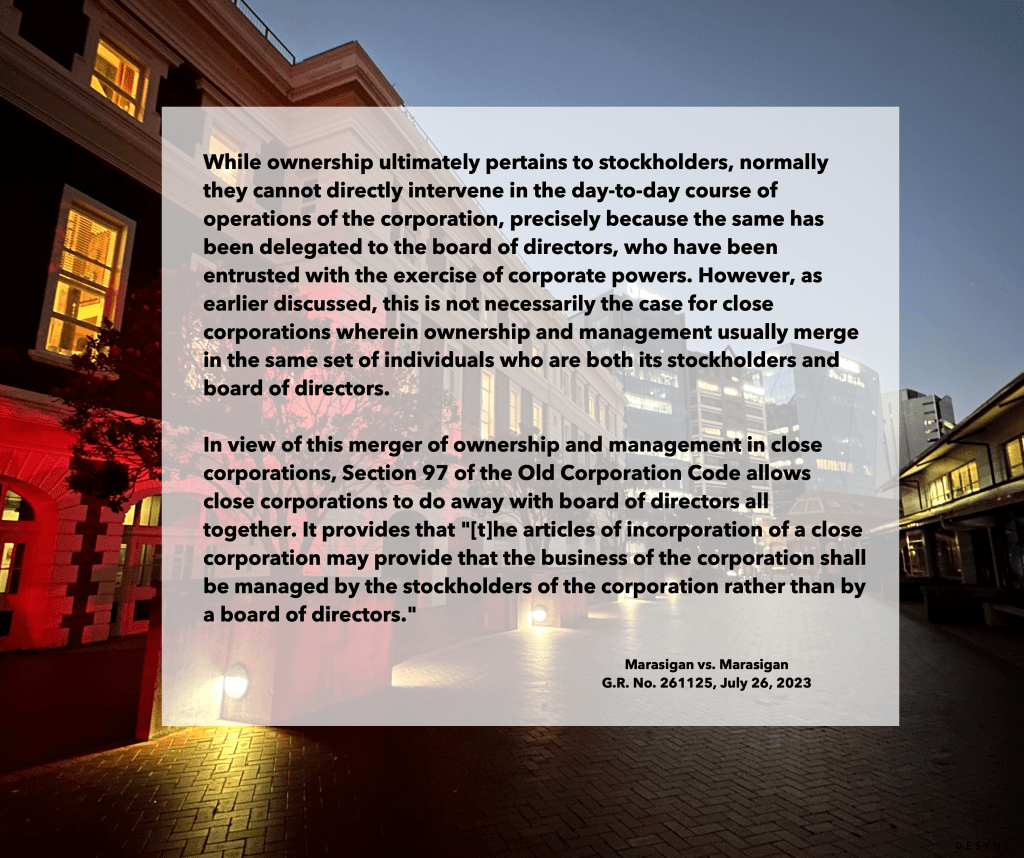 There is a merger of ownership and management in close corporations. Causing Dela Cruz Law Office is engaged in corporate law practice in Iloilo City. Share this: Click to share on X (Opens in new window) X Click to share on Facebook (Opens in new window) Facebook Like Loading... Leave a comment Cancel reply Δ