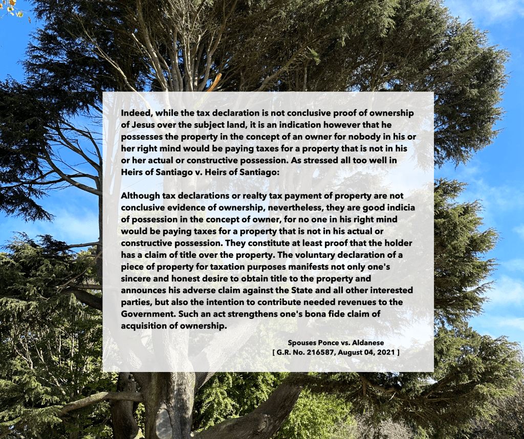 While the tax declaration is not conclusive proof fo ownership, it is an indication that the occupant possesses the property in the concept of an owner. Causing Dela Cruz Law Office is a real estate law practitioner in Iloilo City. Share this: Click to share on X (Opens in new window) X Click to share on Facebook (Opens in new window) Facebook Like Loading... Leave a comment Cancel reply Δ