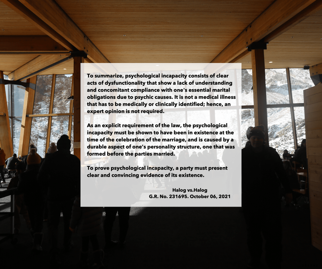 Psychological incapacity consists of clear acts of dysfunctionality that show a lack of understanding and concomitant compliance with one’s essential marital obligations due to psychic causes. Causing Dela Cruz Law Office is a family law practitioner based in Iloilo City. #AnnulmentofMarriage#NULLITYOFMARRIAGE#lawyer#IloiloCity Share this: Click to share on X (Opens in new window) X Click to share on Facebook (Opens in new window) Facebook Like Loading... Leave a comment Cancel reply Δ