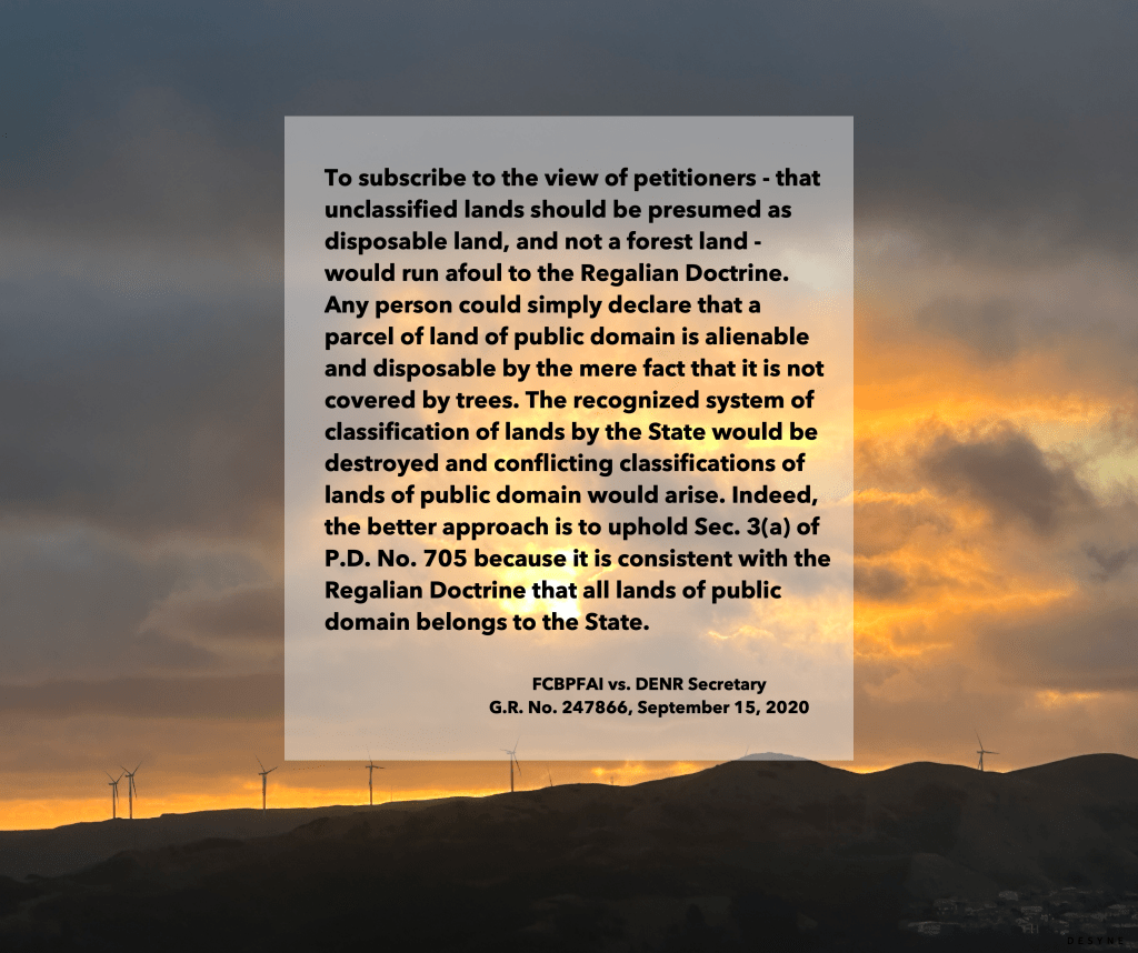 The Regalian Doctrine states that all lands of the public domain belongs to the State. Causing Dela Cruz Law Office is a real estate law practitioner in Iloilo City. Share this: Click to share on X (Opens in new window) X Click to share on Facebook (Opens in new window) Facebook Like Loading... Leave a comment Cancel reply Δ