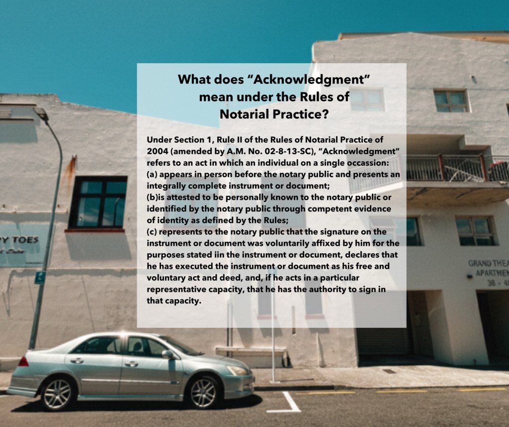What does “Acknowledgment” mean under the Rules of Notarial Practice? This post is brought to you by Causing Dela Cruz Law Office, a law office based in Iloilo City. Share this: Share on X (Opens in new window) X Share on Facebook (Opens in new window) Facebook Like Loading... Leave a comment Cancel reply Δ