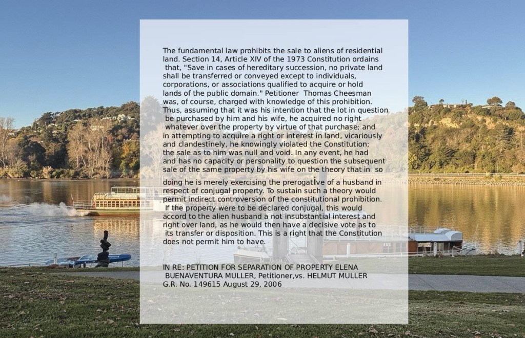 Assuming that it was the foreigner spouse intention that land was purchased by him and his wife, he acquired no right whatever over the property of that purchase. Share this: Share on X (Opens in new window) X Share on Facebook (Opens in new window) Facebook Like Loading... Leave a comment Cancel reply Δ