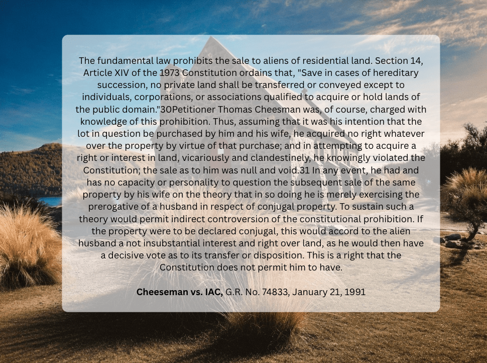 When a foreigner acquired land even if it was purchased by him and his Filipino wife, he acquired no right whatever over the property by virtue of that purchase. Causing Dela Cruz Law Office is a real estate law practitioner based in Iloilo City. #causingdelacruzlawoffice #realestatelawyer #ILOILO #IloiloCity #realestatelaw Share this: Share on X (Opens in new window) X Share on Facebook (Opens in new window) Facebook Like Loading... Leave a comment Cancel reply Δ