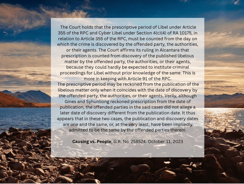 What is the Prescriptive Period of Libel under Article 355 of the Revised Penal Code and Cyber Liber under Section 4(c) 4 of Republic Act 10175? This post is contributed by Causing Dela Cruz Law Office, a criminal defense team based in Iloilo City. #cyberlibel #cybercrime #ILOILO #IloiloCity #causingdelacruzlawoffice Share this: Share on X (Opens in new window) X Share on Facebook (Opens in new window) Facebook Like Loading... Leave a comment Cancel reply Δ