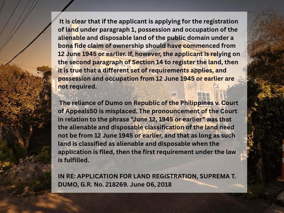 As long as the land is classified as “alienable and disposable” when the application for registration is filed, the petition for registration is valid. Causing Dela Cruz Law Office is a real estate law practitioner based in Iloilo City. Share this: Share on X (Opens in new window) X Share on Facebook (Opens in new window) Facebook Like Loading... Leave a comment Cancel reply Δ
