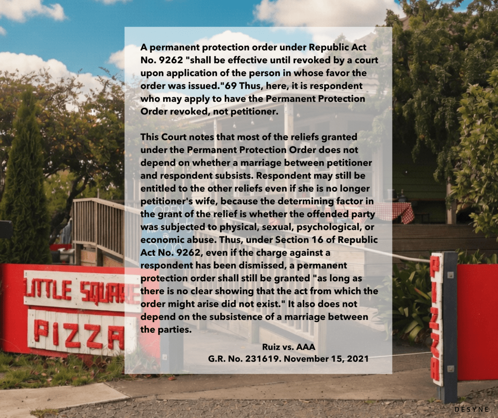 A permanent protection order under RA 9262 (VAWC Law) shall be effective until revoked by a court upon application of the person in whose favor the order was issued. Causing Dela Cruz Law Office is a women and children rights advocate in Iloilo City. Share this: Share on X (Opens in new window) X Share on Facebook (Opens in new window) Facebook Like Loading... Leave a comment Cancel reply Δ