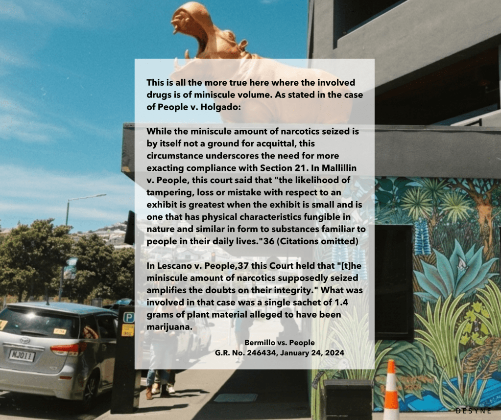 The miniscule amount of narcotics supposedly seized amplifies the doubts on their integrity. Causing Dela Cruz Law Office is engaged in criminal law practice in Iloilo City. Share this: Share on X (Opens in new window) X Share on Facebook (Opens in new window) Facebook Like Loading... Leave a comment Cancel reply Δ
