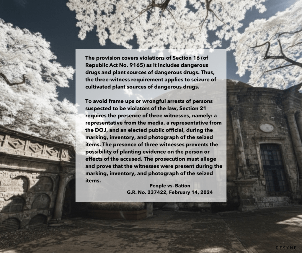 The 3 witnesses requirement before the seizure of dangerous drugs including cultivated plant sources is effected. Causing Dela Cruz Law Office is a law firm based in Iloilo City. Share this: Share on X (Opens in new window) X Share on Facebook (Opens in new window) Facebook Like Loading... Leave a comment Cancel reply Δ